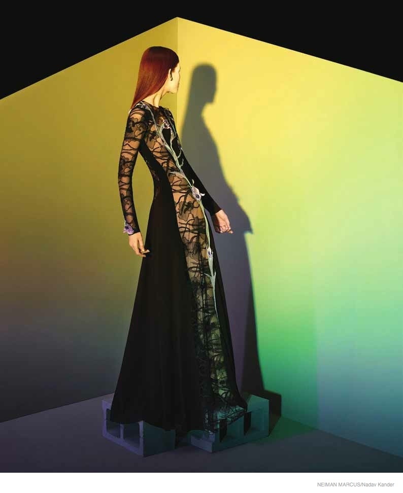 По современной мерке одна огромна — 26 полос, практически отдельный журнал — при этом это не просто лукбук поступлений нового сезона, а именно творческий проект, со вкусом поданный и глубоко проработанный. Из-за специфического освещения, слишком резких контрастов многие вещи узнаются не сразу, однако, оторваться от них невозможно. Особенно роскошно смотрятся ансамбль от Alexander McQueen и ведьмовское платье Bottega Veneta, кадры с ними, словно моменты классики фильмов ужасов. А Ventino и Oscar de la Renta напоминают первые цветные фильмы о Дракуле и, возможно, раннего Полански. Ощущение заколдованности самого пространства и всего происходящего в нем — вот наиболее точно определение того послевкусия, от которого невозможно избавиться, закрыв галерею снимков от Neman Marcus.
